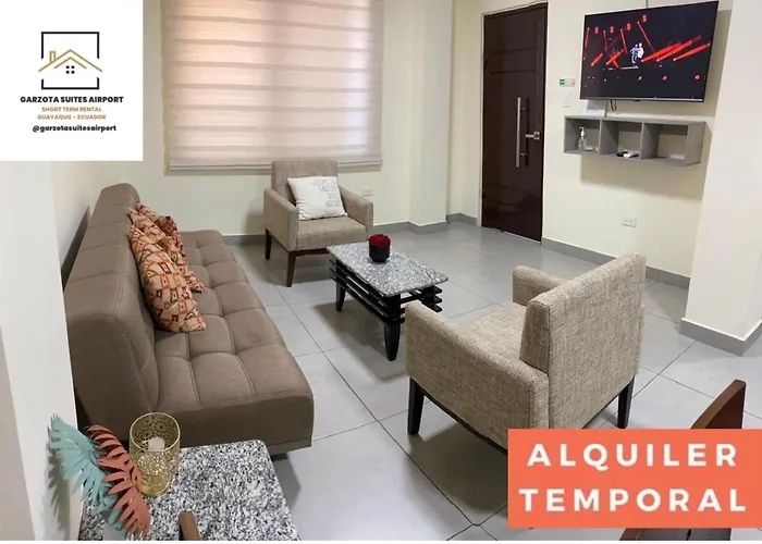 グアヤキルのGarzota地区にあるGarzota Suites Gardensアパ-トはオルメド・ホセ・ホアキン国際空港から10キロメ-トル離れています. サマネス公園から4.1キロメ-トルの場所に位置するアパ-トメントは,2のベッドル-ムと器具でいっぱいの台所があります.